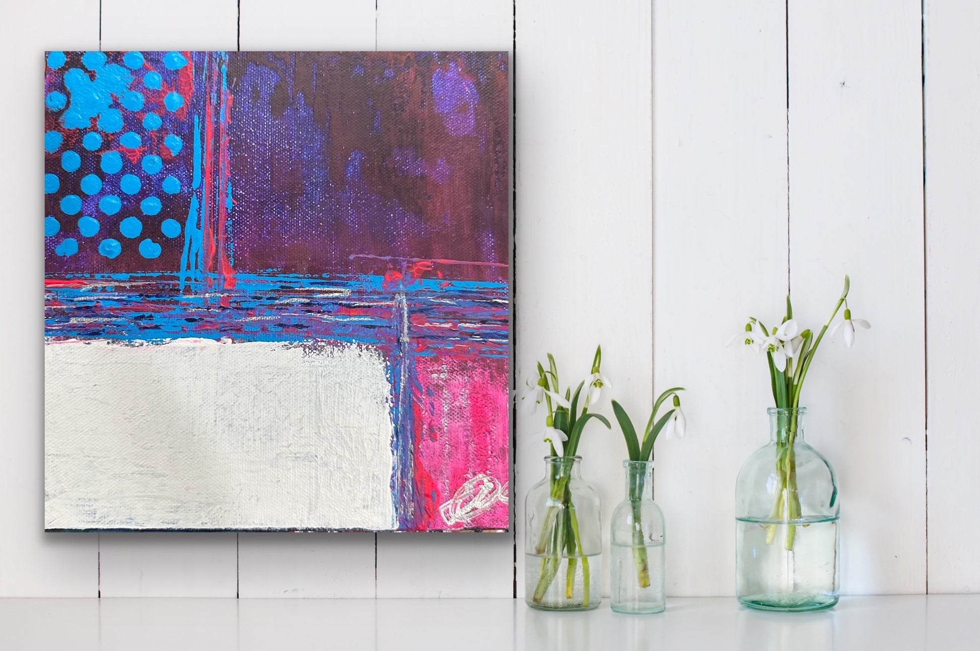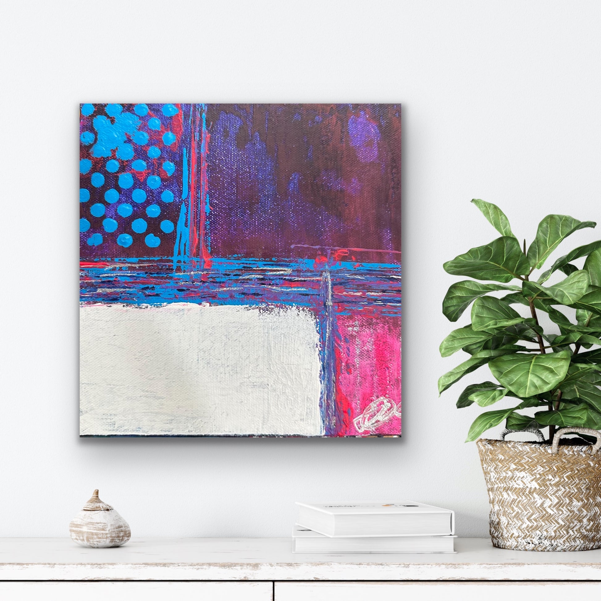 Introducing "Dancing Dots" - a mesmerizing piece of artwork that will add vibrancy and playfulness to any space. This captivating painting features a backdrop of soft pink and purple hues, adorned with elegantly scattered blue polka dots.
