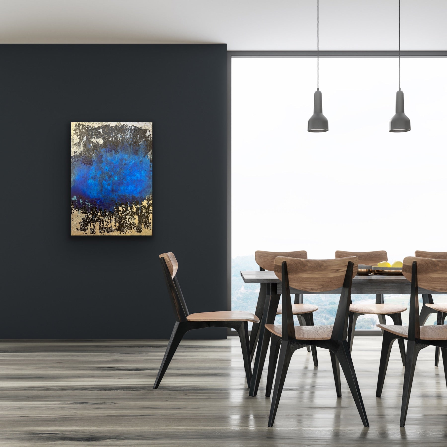 "Midnight Serenity" - A stunning 24x18 acrylic art on canvas that captures the essence of a peaceful night sky. With a beautiful mix of blue, silver, and black hues, this piece adds an elegant touch to any room it is displayed in. Handcrafted using high-quality acrylic paints and canvas, "Midnight Serenity" is a timeless piece that will never go out of style.