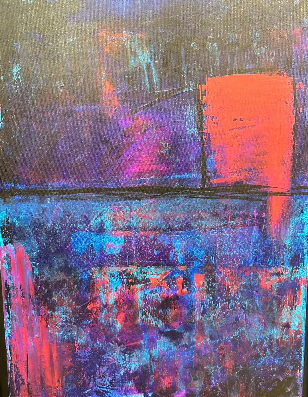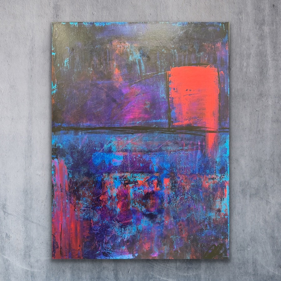 Introducing "The Awakening" - a stunning acrylic and cold wax painting on a 24x18 stretched canvas. This captivating masterpiece radiates an air of mystery and intrigue, incorporating a rich and vibrant color palette of reds, blues, blacks, and purples.